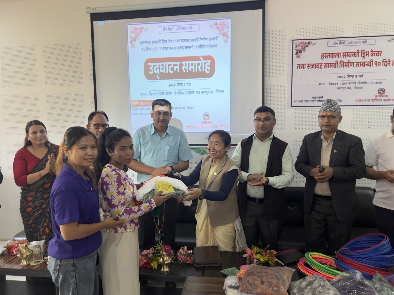 मिति २०८२ जेठ २ गते भरतपुर–१० मा एक महिने ढाका बुनाई र १० दिने ड्रिम केचर तालिमको उद्घाटन कार्यक्रम माननीय मन्त्री श्री शुकमाया तामाङज्यूको प्रमुख आतिथ्यतामा र प्रमुख उद्योग अधिकृत श्री बिनोद पौडेलज्यूको अध्यक्षतामा सम्पन्न भयो।