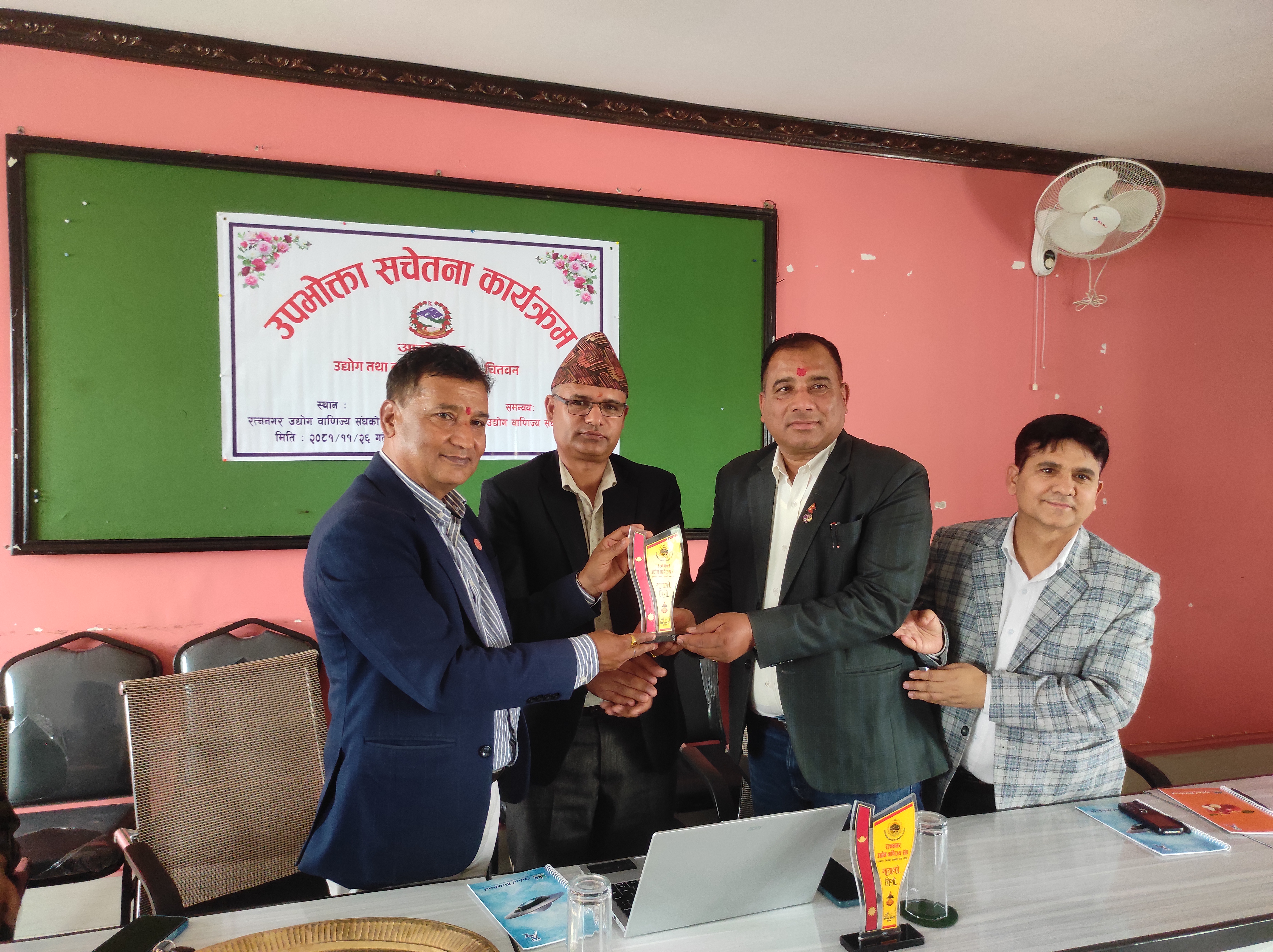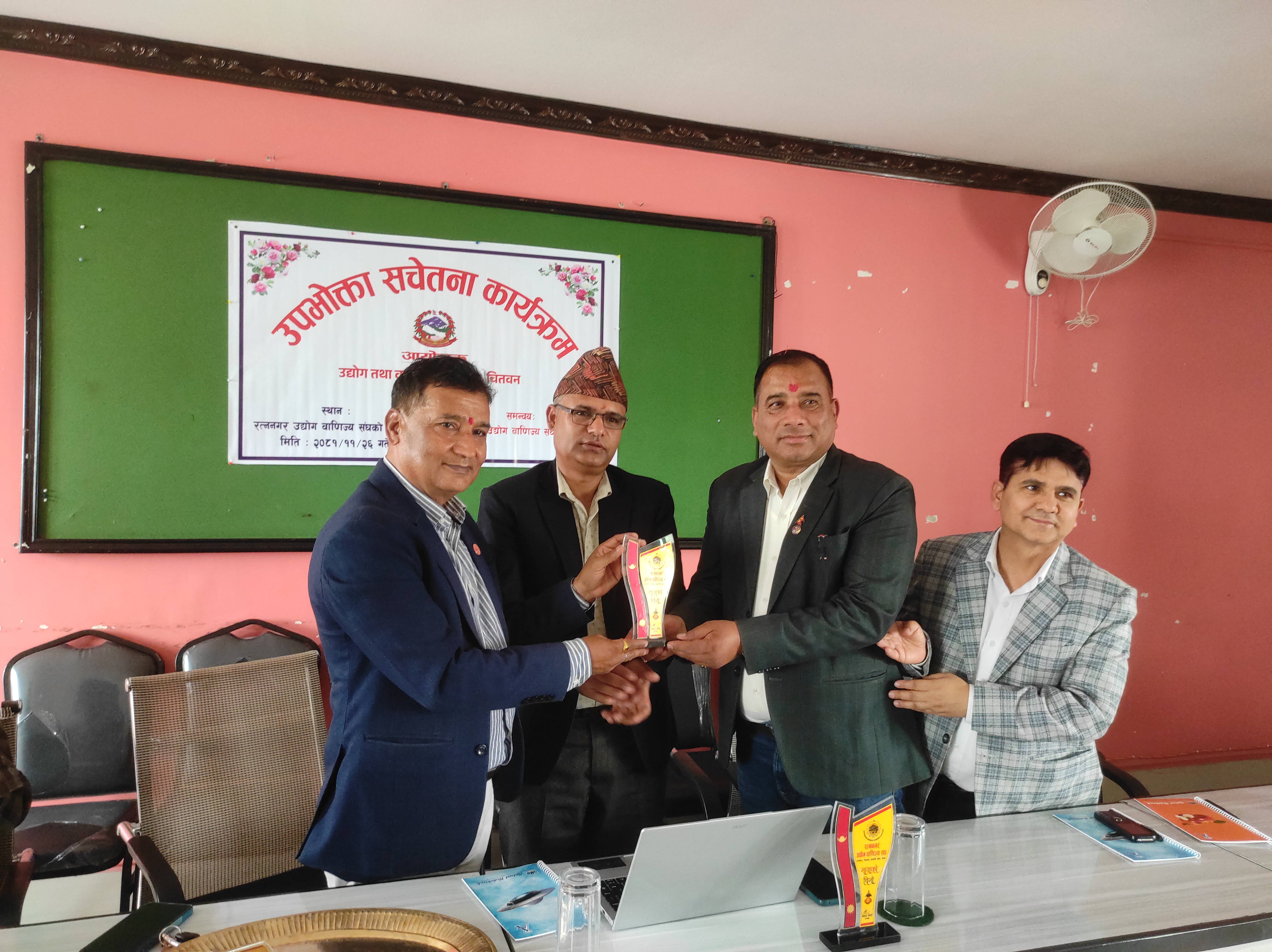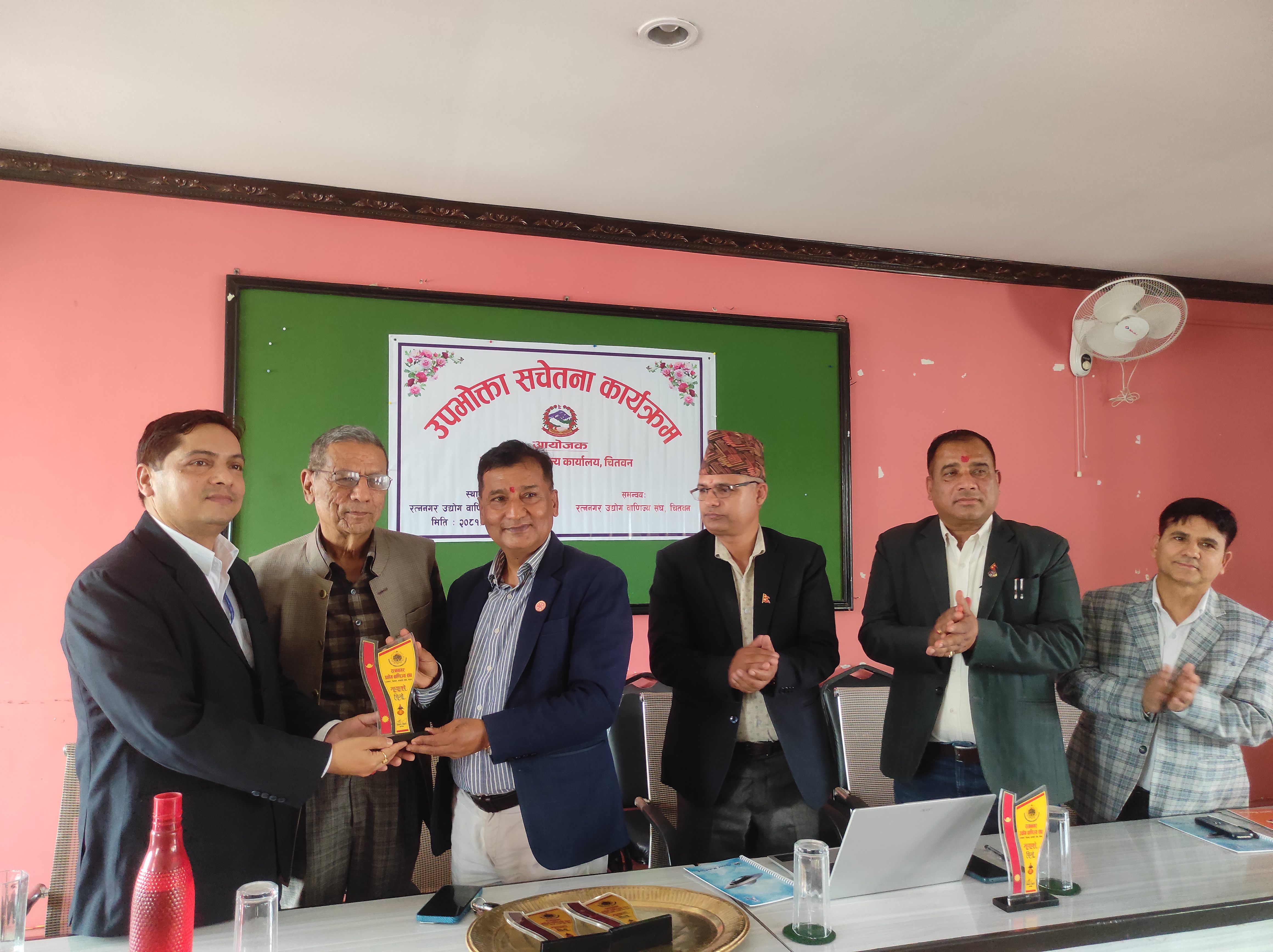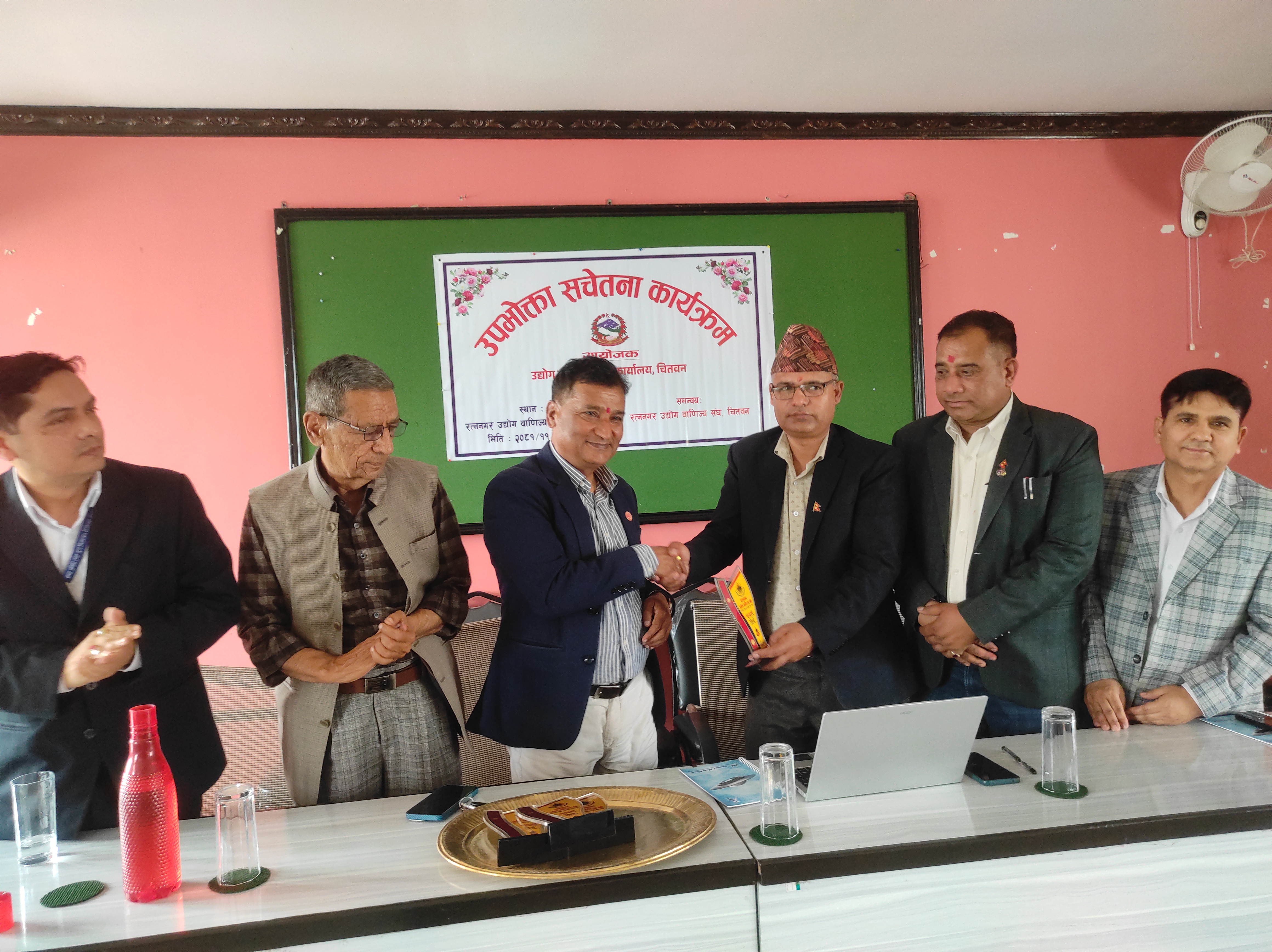 २०८१ साल फागुन २६ गते, सोमबार, रत्ननगर उद्योग वाणिज्य सङ्घको सभाहलमा उद्योग तथा वाणिज्य कार्यालय,चितवनका प्रमुख उद्योग अधिकृत विनोद पौडेलज्यूको अध्यक्षतामा तथा रत्ननगर उद्योग वाणिज्य सङ्घ,चितवनको समन्वयमा उपभोक्ता सचेतना कार्यक्रम सफलतापूर्वक सम्पन्न भयो।