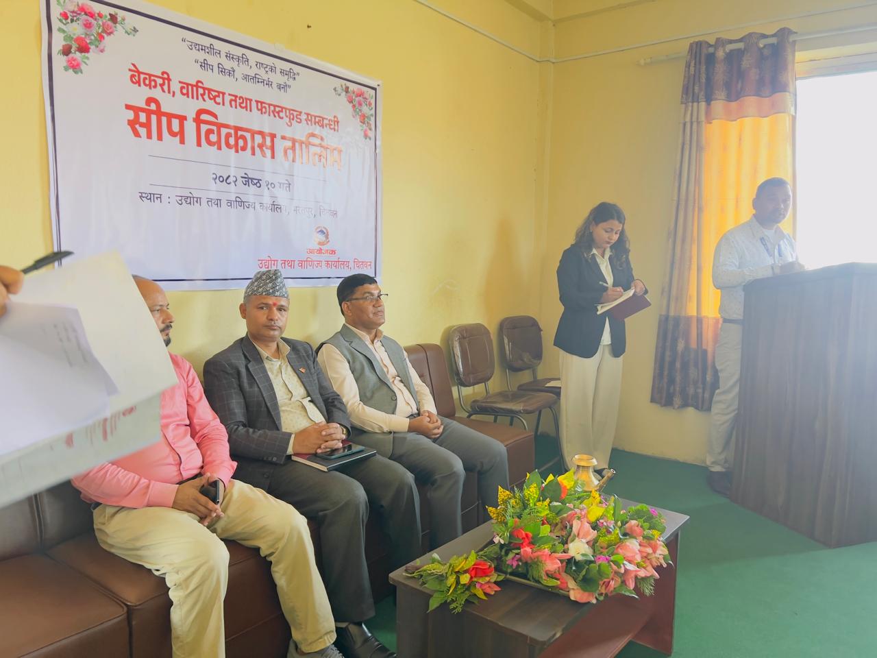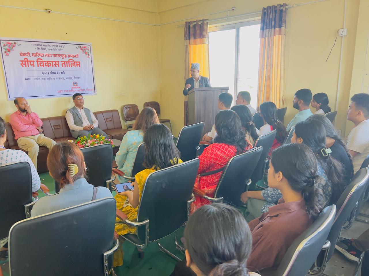 मिति २०८२।०२।१० गते, उद्योग तथा वाणिज्य कार्यालय, चितवनको आयोजनामा भरतपुर महानगरपालिका वडा नं. १० स्थित बेकरी, वारिष्टा तथा फास्टफुड सम्बन्धी सीप विकास तालिमको शुभारम्भ