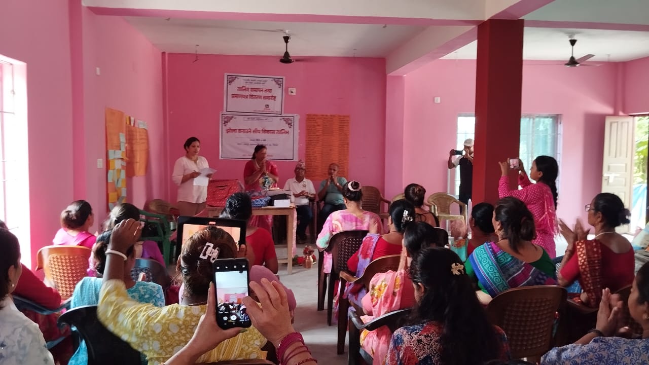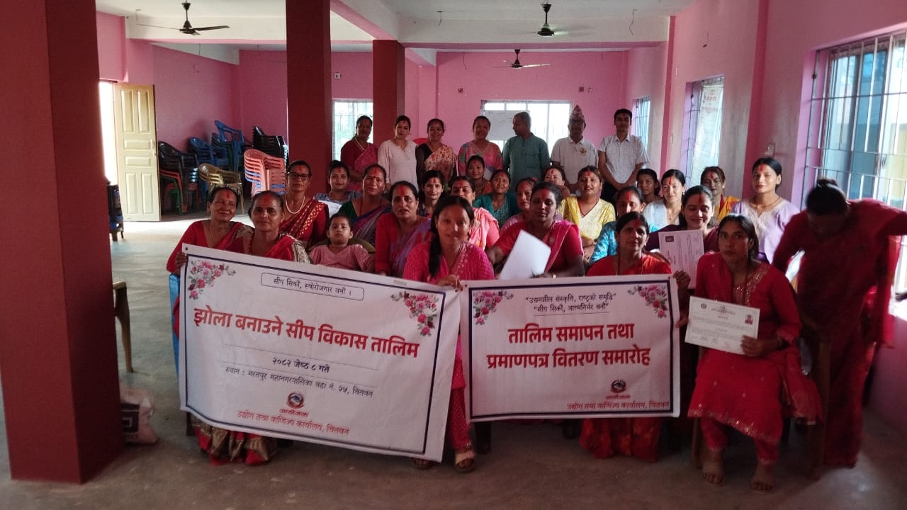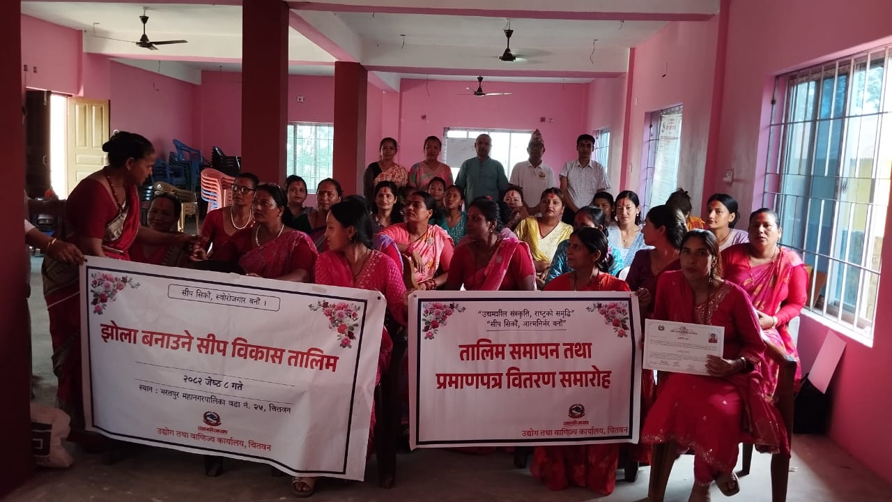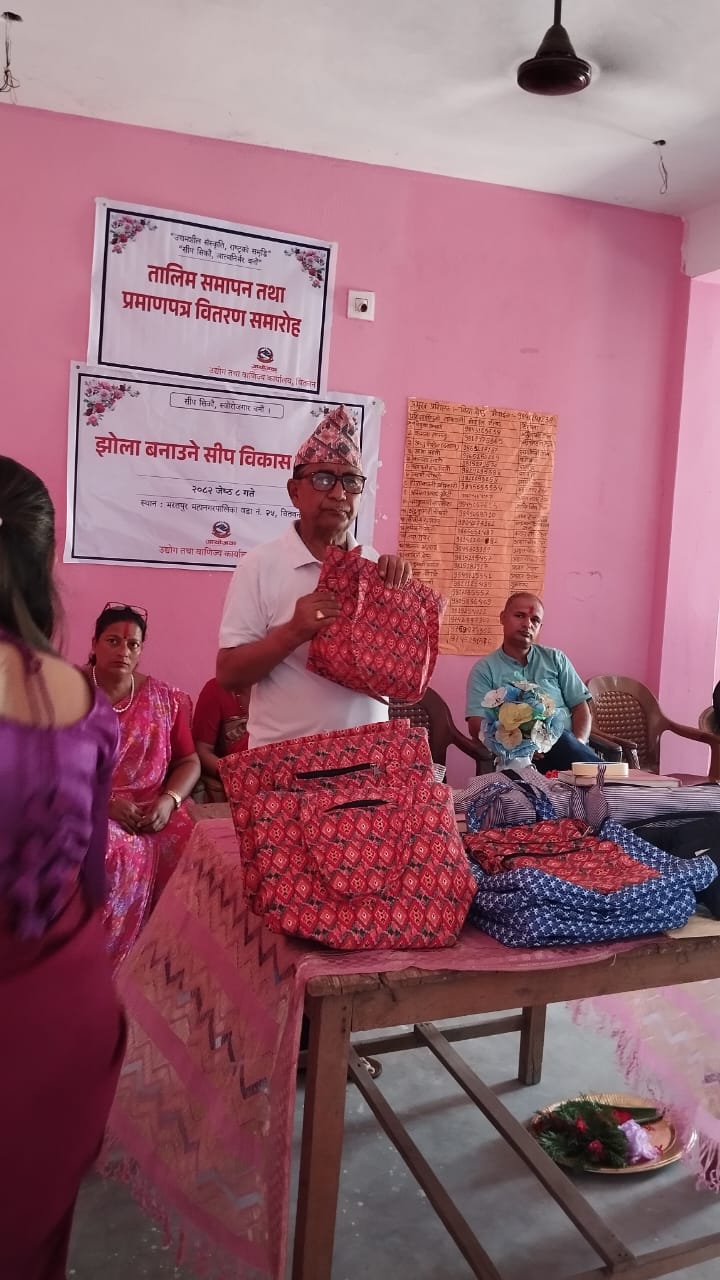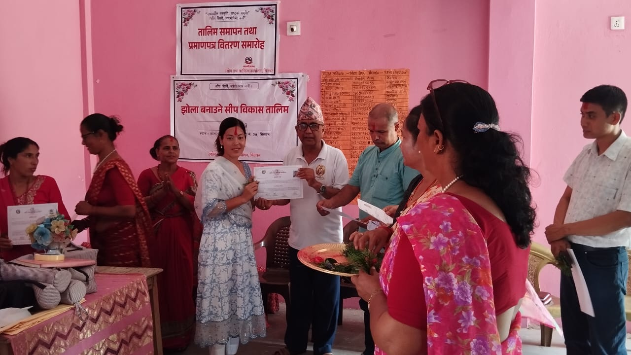 भरतपुर महानगरपालिका वडा नम्बर २५ झोला बनाउने तालिम समापन कार्यक्रम मिति २०८२ जेठ ३१ गते वडा अध्यक्ष श्री छविलाल सापकोटा ज्यूको प्रमुख आथित्यतामा सम्पन्न भयाे।