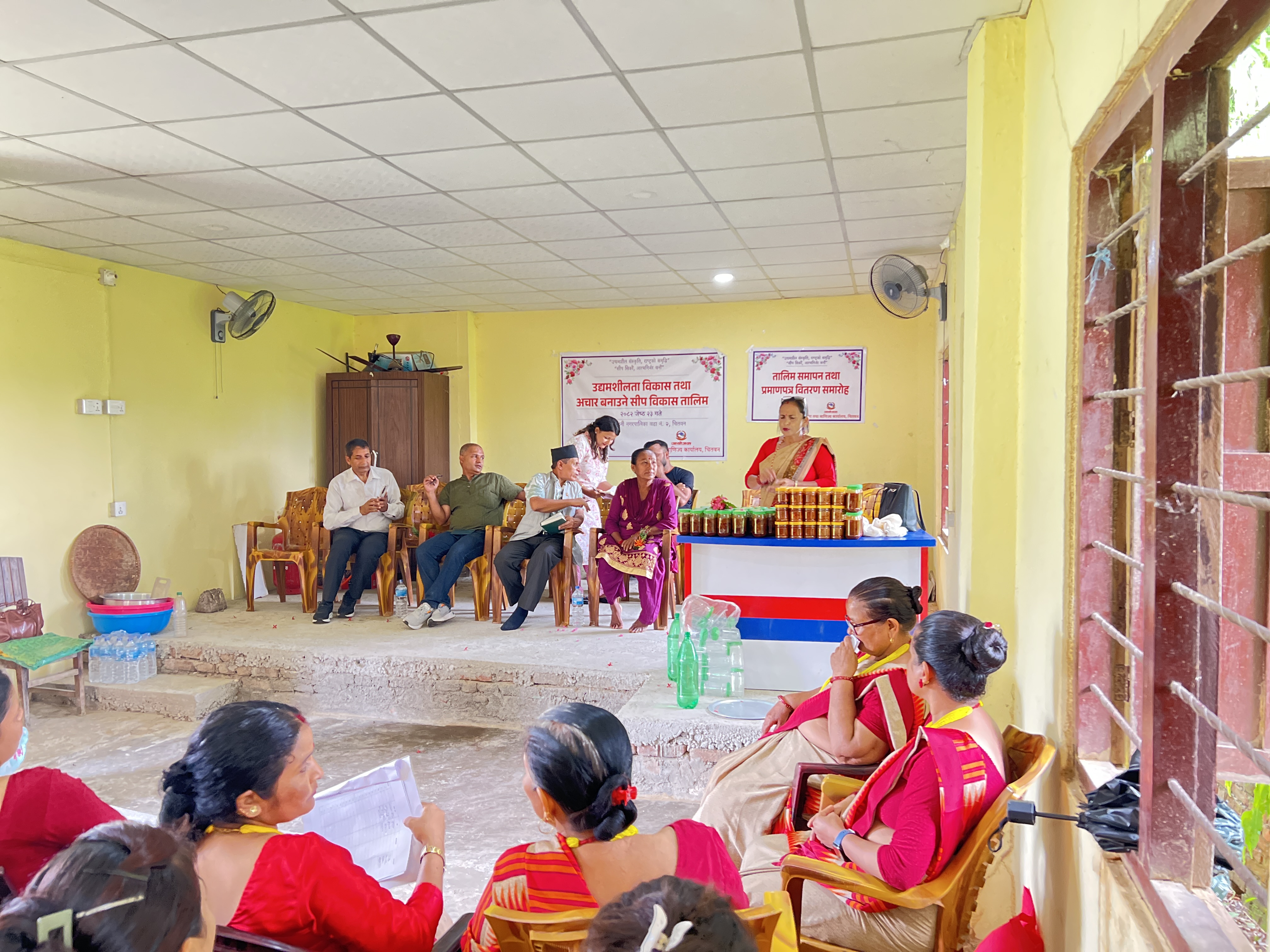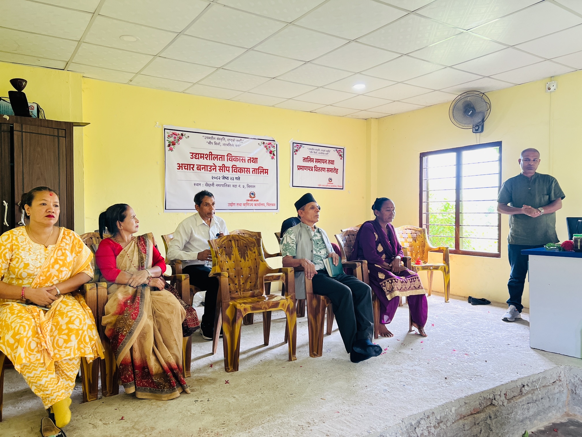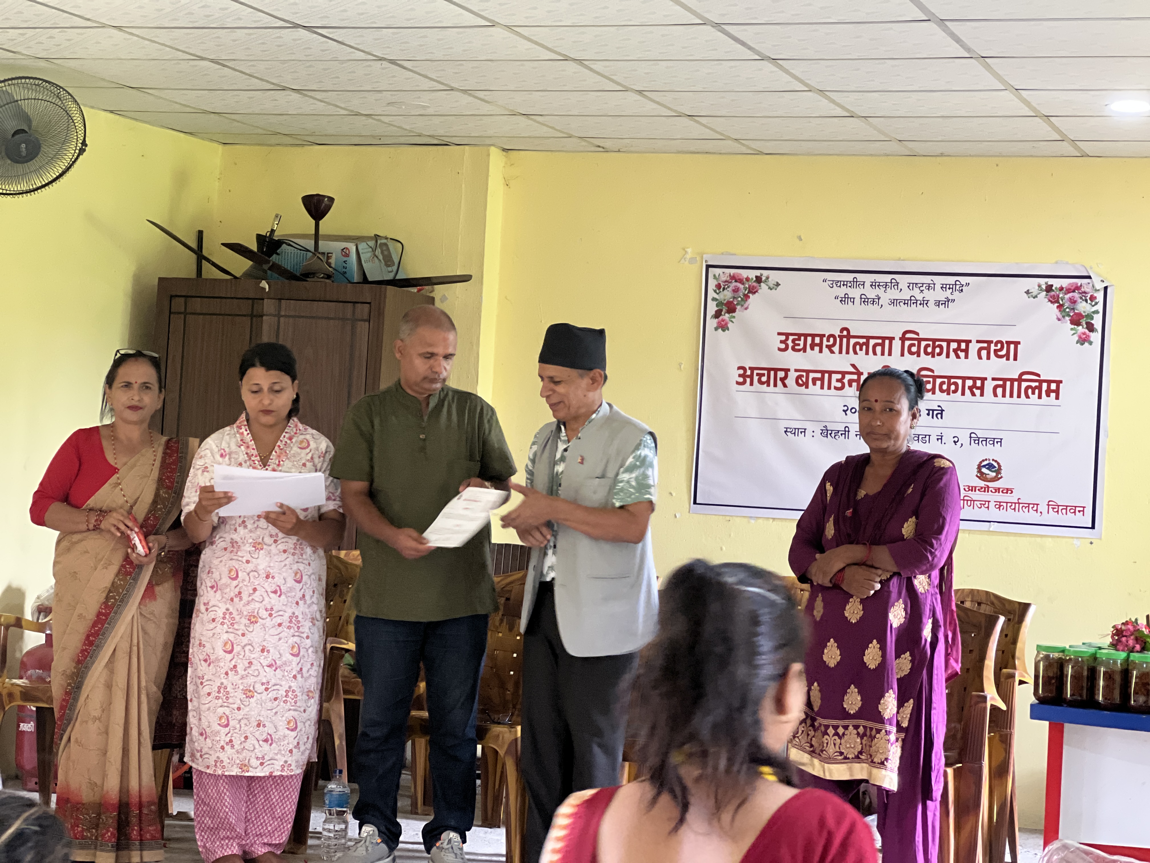 आ.व. 081-082 मा मिति 2082-02-23 देखि 2082-03-07 सम्म उद्यमशिलता तथा अचार बनाउने तालिम खैरहनी नगरपालिका वडा नं. 2, चितवनमा सञ्चालन भएका केही तस्विरहरू।